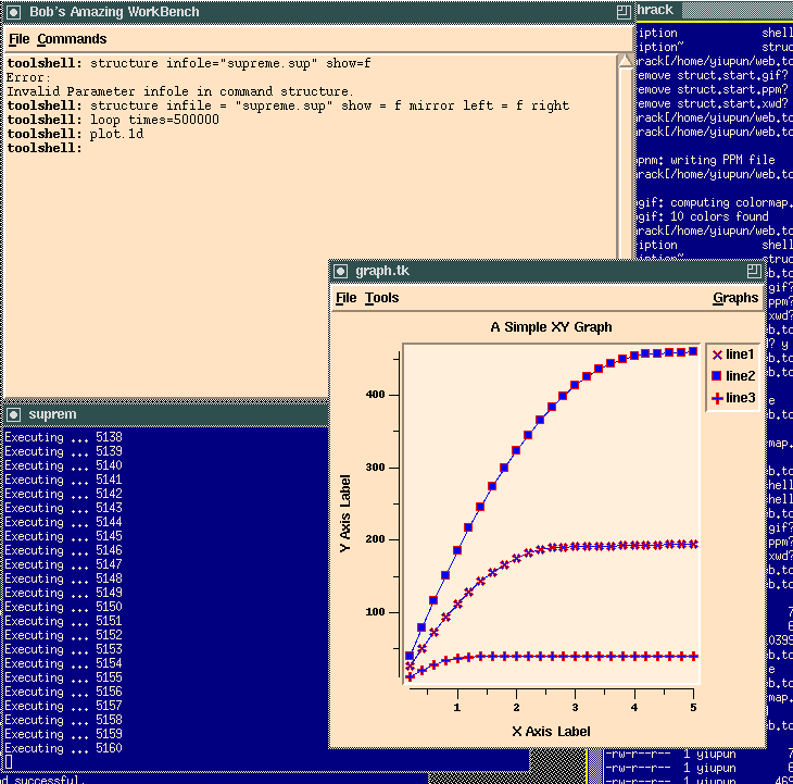 While suprem is busy running in the background, we can use the command shell to continue issuing commands to other tools. A prototype graphing tool was loaded using the command plot.1d from the command shell.