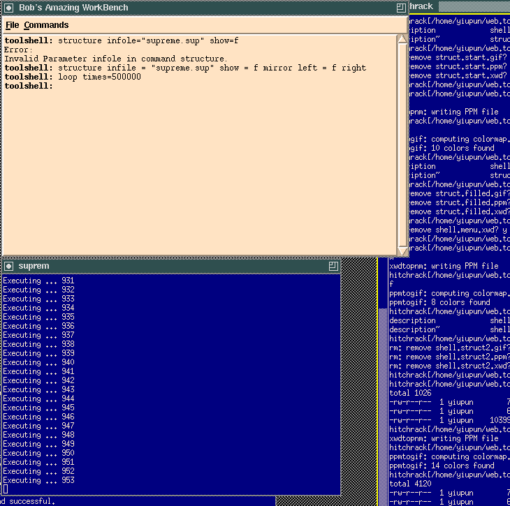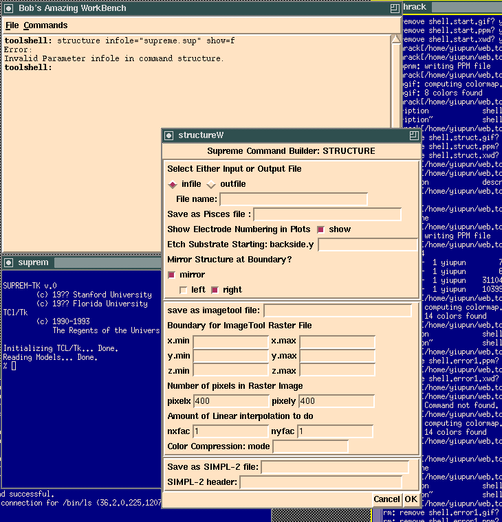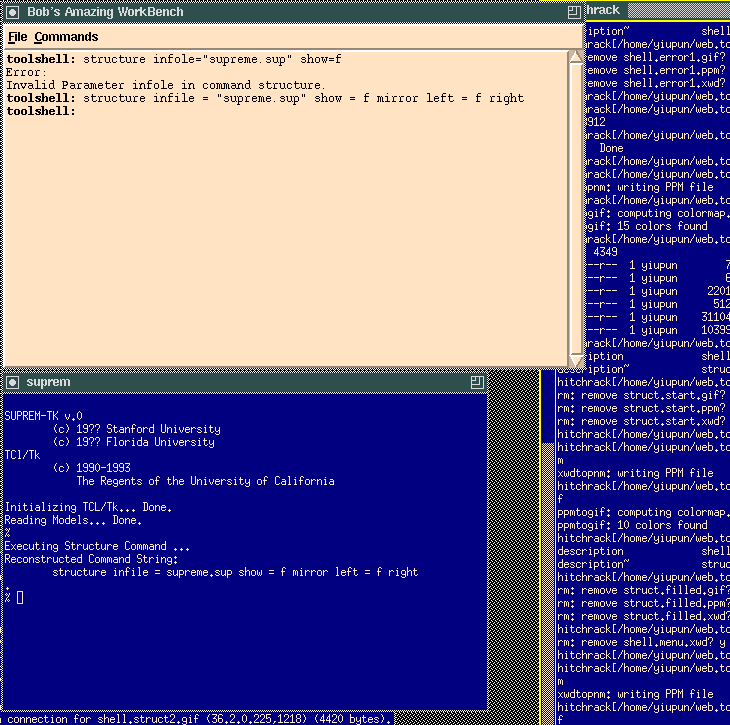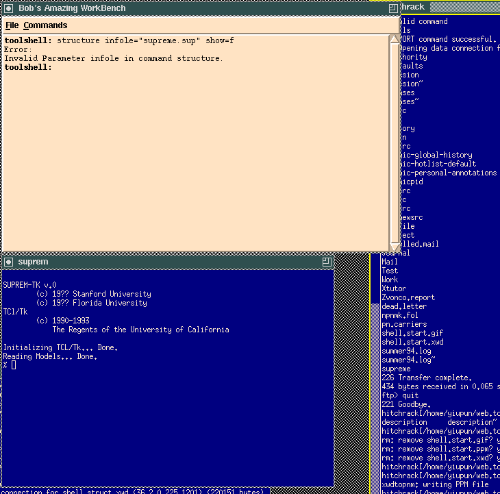 Since the tool shell and the individual tools are running as separate processes, we can have a particular tool executing a long calculation in the background, and the shell would stay responsive and continue to accept commands from the user. Here we ask the prototype TCL suprem to execute a dummy routine that does nothing other than incrementing a counter and displaying the current counter value on the screen