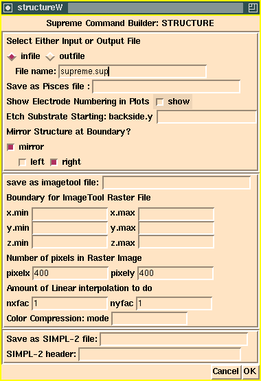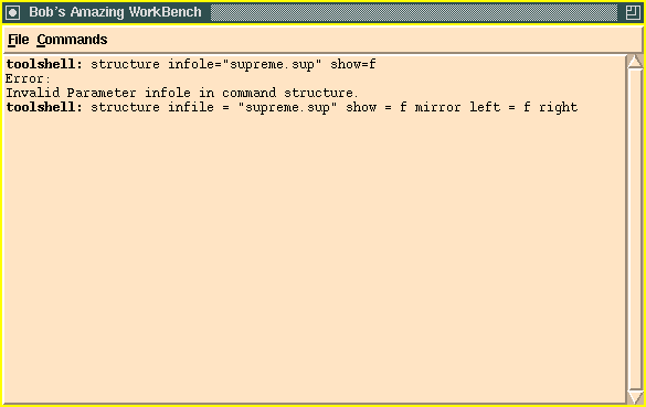 After clicking on the OK button, the structure command is automatically filled in with the appropriate parameter values using information specified by the user on the form. The user now has a chance to further edit the command before execution using the return key.