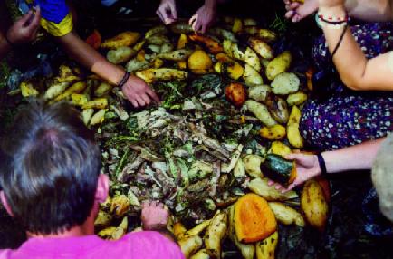 ground. Then cover the stones with leaves. Stack on food wrapped in leaves/plastic